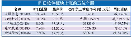 数据显示,截至去年第三季度,软件板块个股业绩出现两极分化,其中有9只软件类个股净利润增长率接近或超过100%,其中超图软件(300036)达到了176.07%,而同时,有9只个股净利润增长率下滑接近或超过了100%。