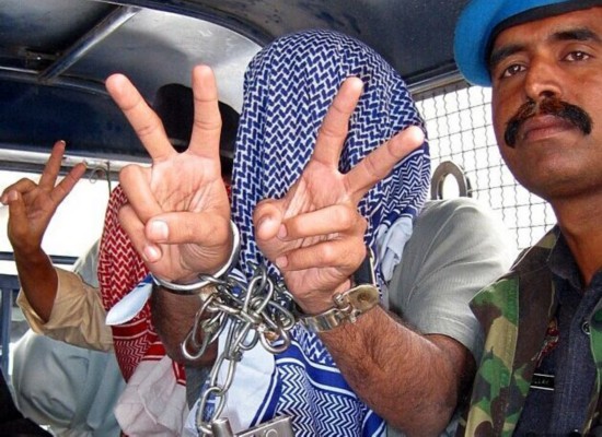 图注2: 一名名为苏海尔 努尔的伊斯兰激进分子坐在警车内,比了一个“V”字手势。图片摄于2002年12月28日,巴基斯坦城市卡拉奇。