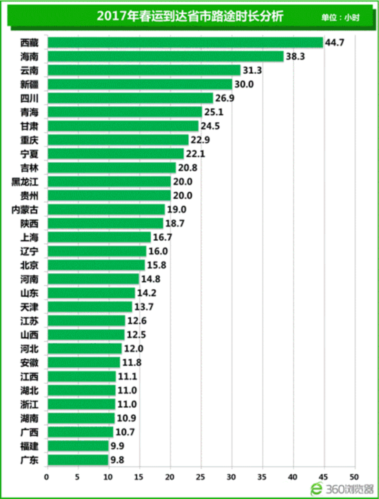 通过对到达各省市终点站的火车路途时长分析,2017年春运回家人均火车耗时达到15.36小时,其中从全国各地开往我国边疆地区的列车运行时间相对较长,路途较远,特别是从回到西藏自治区的列车平均需要44.7个小时,远高于其他省市。