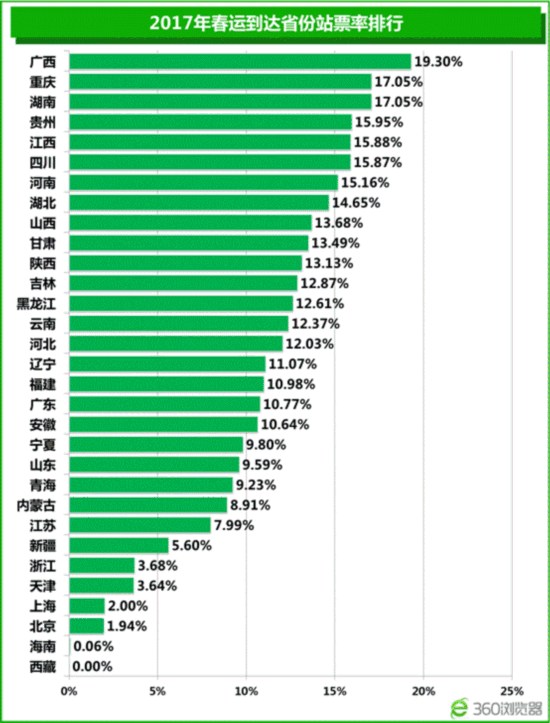 据360浏览器抢票大数据分析,2017年春运抢票十大始发站城市依次为:广州、上海、深圳、北京、杭州、宁波、武汉、福州、东莞和温州。其中,超过60%的火车票始发于广州(18.91%)、上海(15.68%)、深圳(14.28%)与北京(12.13%)这4个城市。出发地进一步聚焦南方城市,北京成为热门出发城市top10中唯一的北方城市。